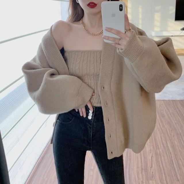 D.studio韓版高級感奶茶色系針織外套+針織背心兩件套裝針織上衣毛衣長袖上衣女裝衣服寬鬆上衣 J248