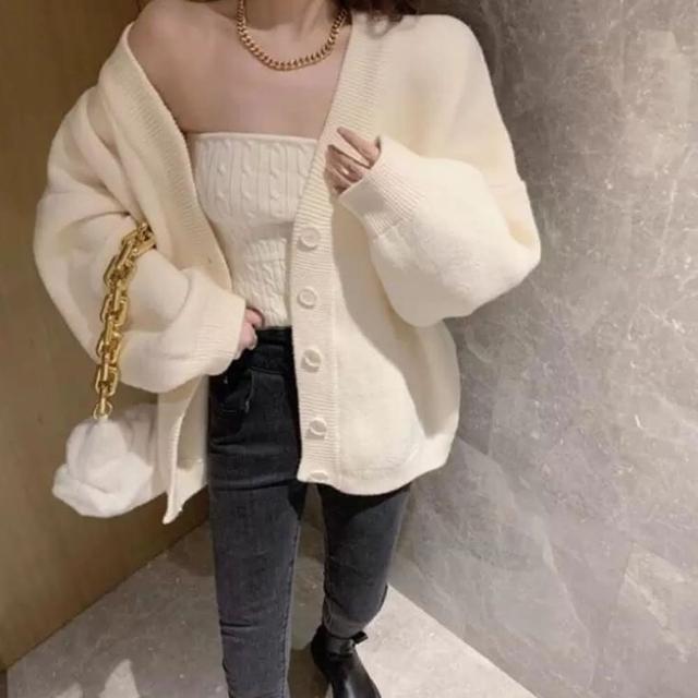 D.studio韓版高級感奶茶色系針織外套+針織背心兩件套裝針織上衣毛衣長袖上衣女裝衣服寬鬆上衣 J248