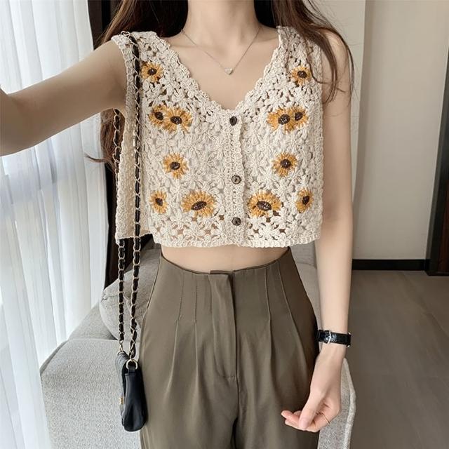 D.studio韓版設計感刺繡鏤空小雛菊針織背心短版背心 上衣 小可愛 女裝 衣服 短版上衣 短板上衣 V301