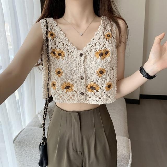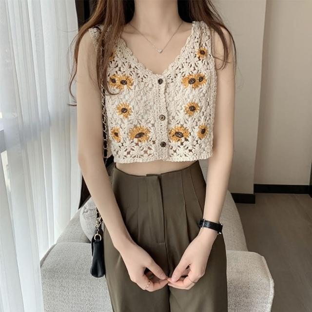 D.studio韓版設計感刺繡鏤空小雛菊針織背心短版背心 上衣 小可愛 女裝 衣服 短版上衣 短板上衣 V301