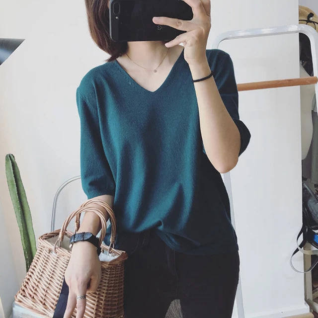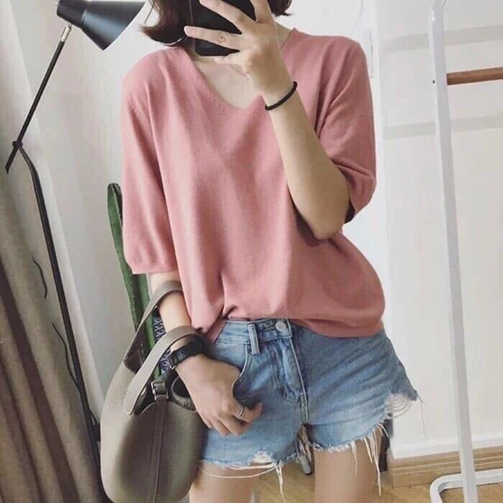 D.studio韓版素色寬鬆V領針織上衣短袖上衣 短袖t恤 女裝 顯瘦上衣 衣服 寬鬆上衣 素T T246