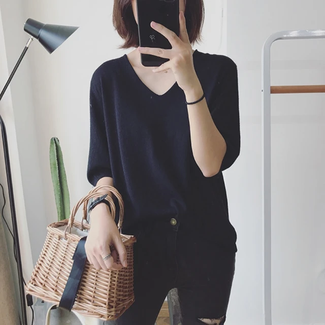 D.studio韓版素色寬鬆V領針織上衣短袖上衣 短袖t恤 女裝 顯瘦上衣 衣服 寬鬆上衣 素T T246