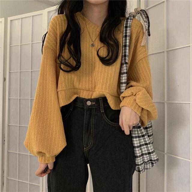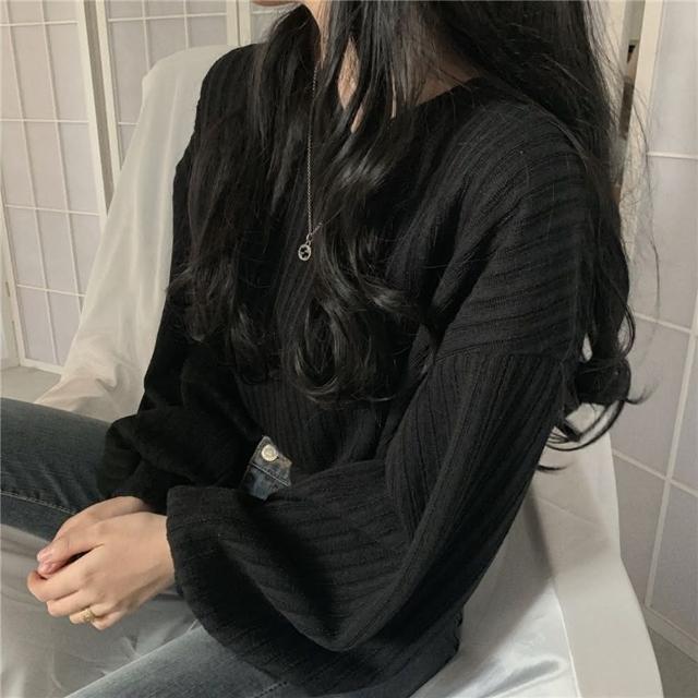 D.studio韓版慵懶風寬鬆V領短版針織上衣長袖上衣長袖t恤女裝 衣服 寬鬆上衣顯瘦上衣素T毛衣 W180