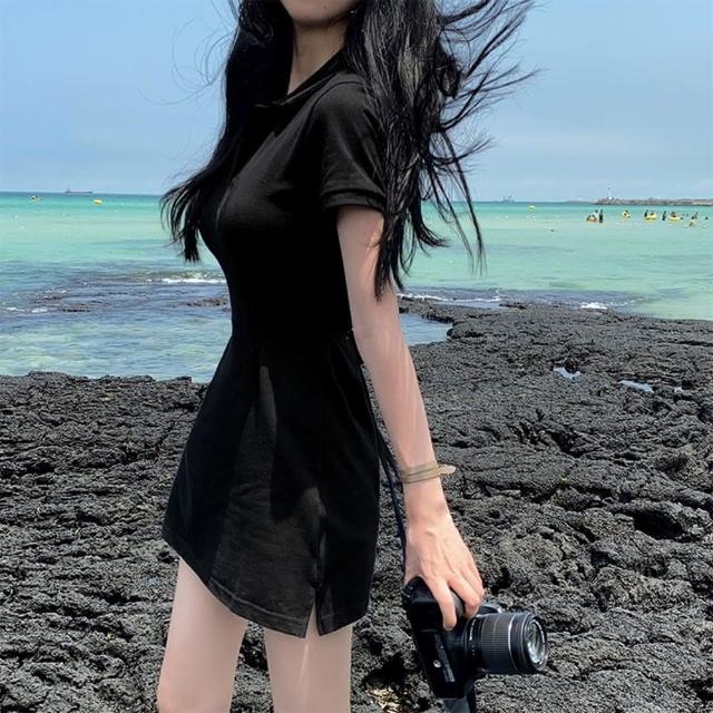 D.studio韓版復古小眾翻領修身顯瘦小個子連衣裙短裙 連身裙 短袖上衣 女裝 衣服 套裝 顯瘦上衣 S266