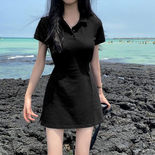 D.studio韓版復古小眾翻領修身顯瘦小個子連衣裙短裙 連身裙 短袖上衣 女裝 衣服 套裝 顯瘦上衣 S266