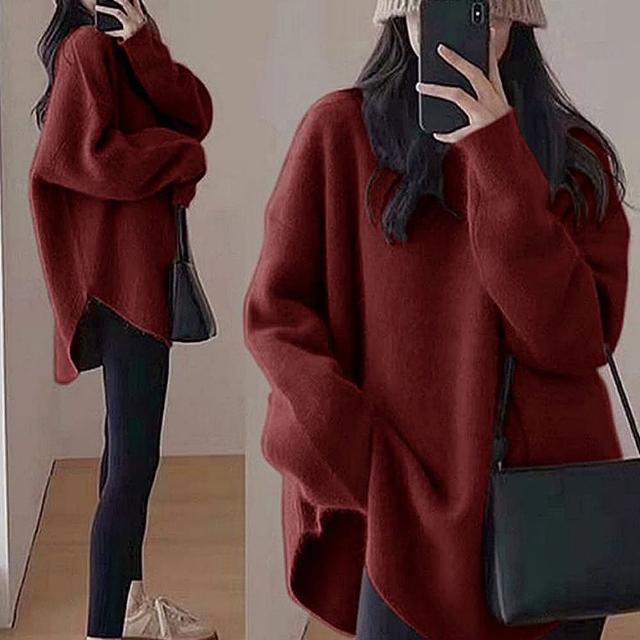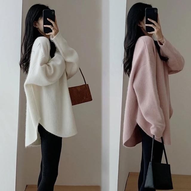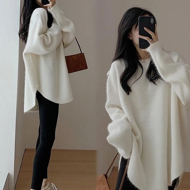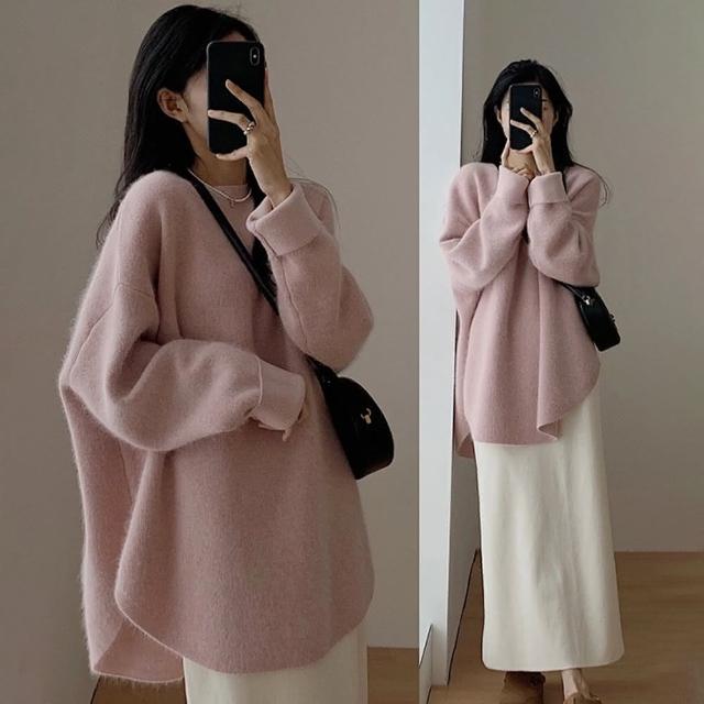 D.studio韓版溫柔慵懶開叉毛衣針織上衣長袖上衣女裝衣服寬鬆上衣 顯瘦上衣長袖t恤冬裝發熱衣 W429