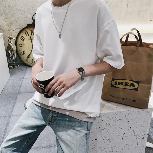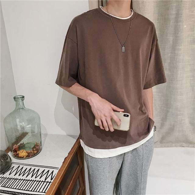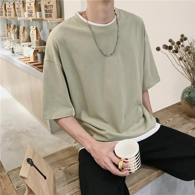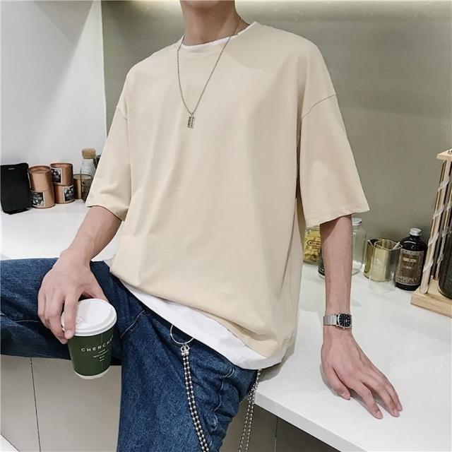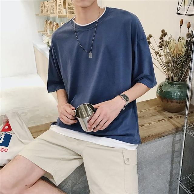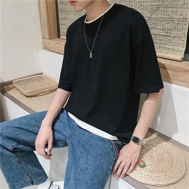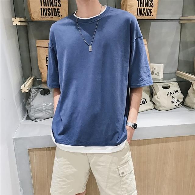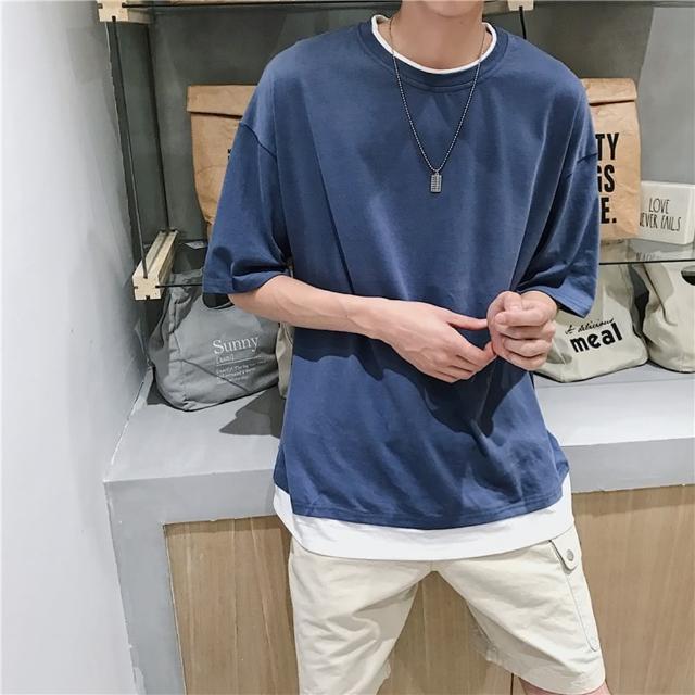 D.studio韓版寬鬆落肩袖假兩件短袖上衣短袖t恤女裝顯瘦上衣衣服寬鬆上衣素T短袖男上衣男 T510