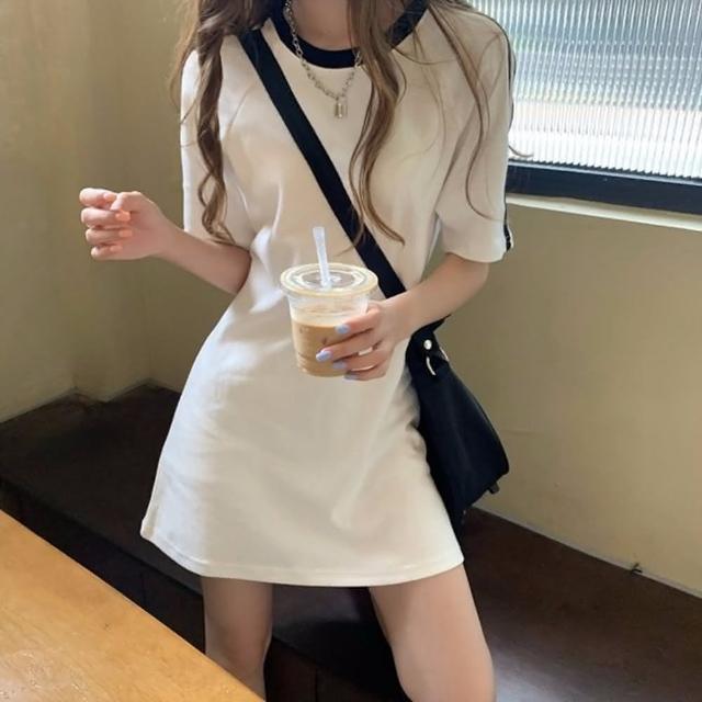 D.studio韓版小個子顯瘦休閒中長款連衣裙洋裝套裝連身裙短袖上衣短袖t恤女裝寬鬆上衣S203