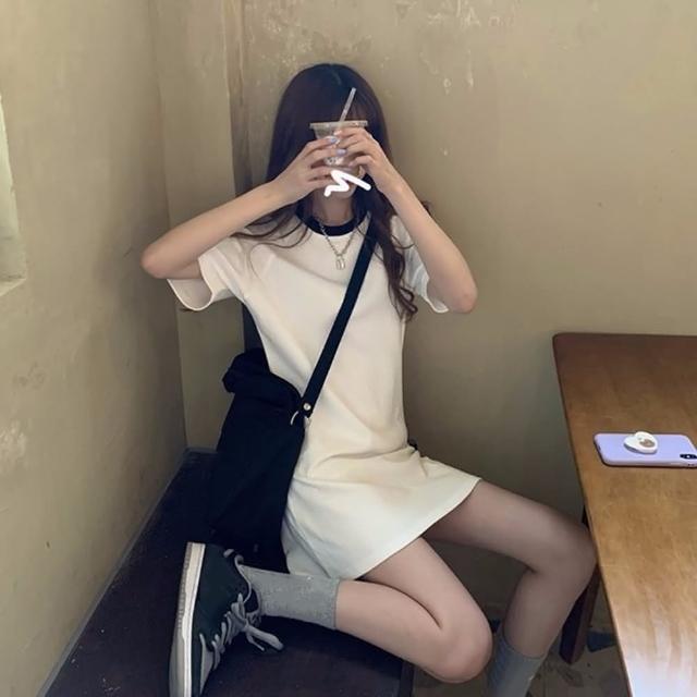 D.studio韓版小個子顯瘦休閒中長款連衣裙洋裝套裝連身裙短袖上衣短袖t恤女裝寬鬆上衣S203