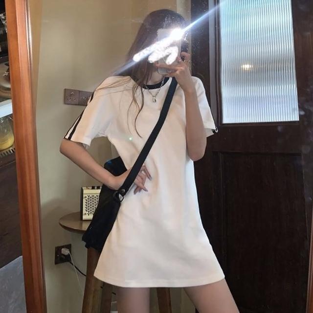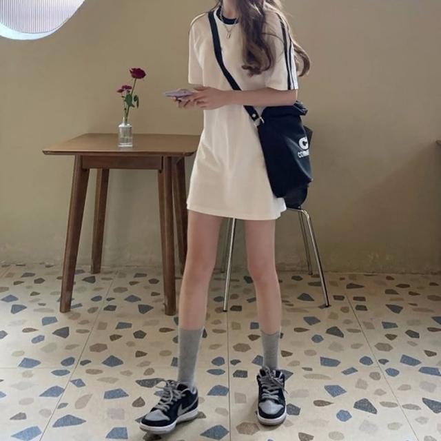 D.studio韓版小個子顯瘦休閒中長款連衣裙洋裝套裝連身裙短袖上衣短袖t恤女裝寬鬆上衣S203