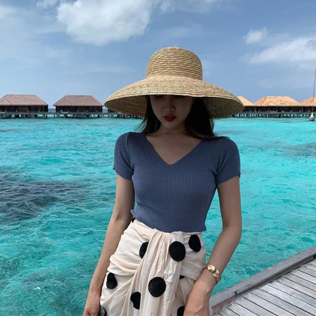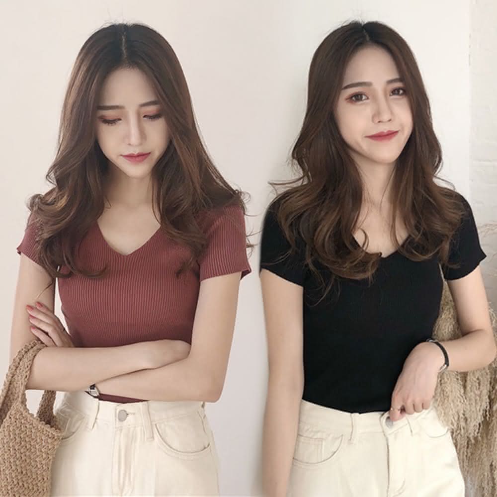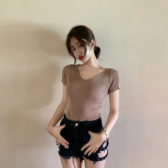 D.studio韓版復古色系V領針織短袖上衣短袖t恤 女裝 顯瘦上衣 衣服 寬鬆上衣 短袖T恤 素T T200