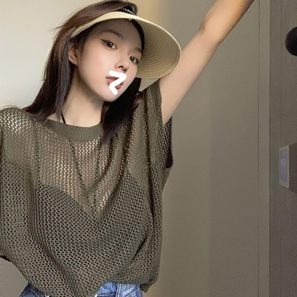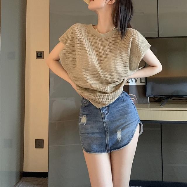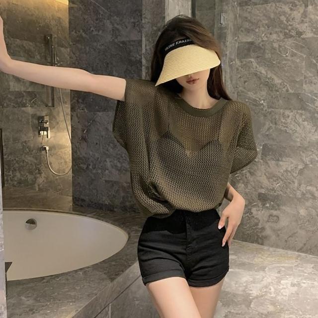 D.studio韓版氣質透視鏤空針織上衣短袖上衣 短袖t恤 女裝 顯瘦上衣 衣服 夏天女裝 T578