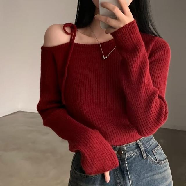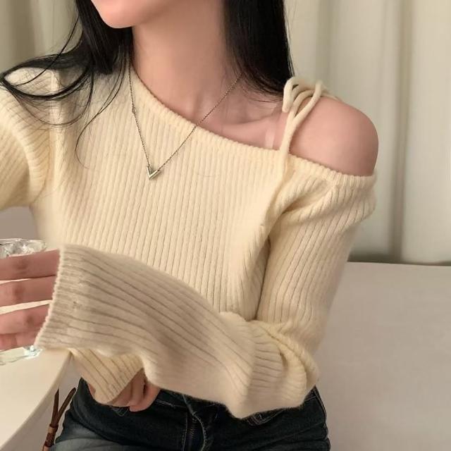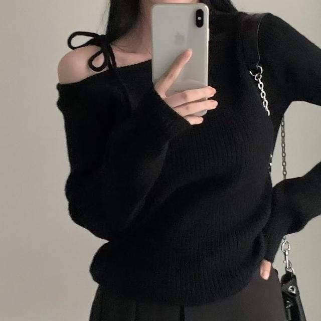 D.studio韓版氣質斜肩露肩顯瘦針織上衣 毛衣 長袖上衣 女裝 衣服 長袖t恤 發熱衣 保暖上衣 冬裝 W521