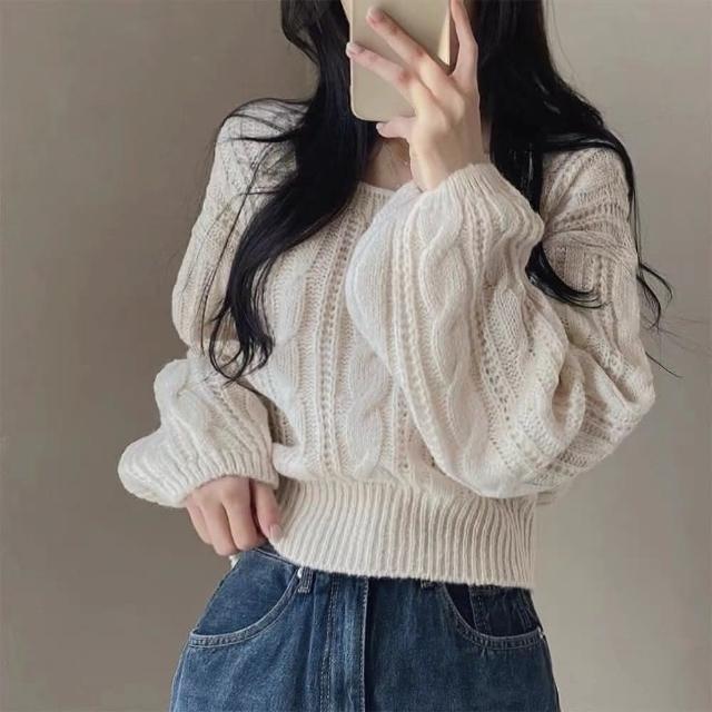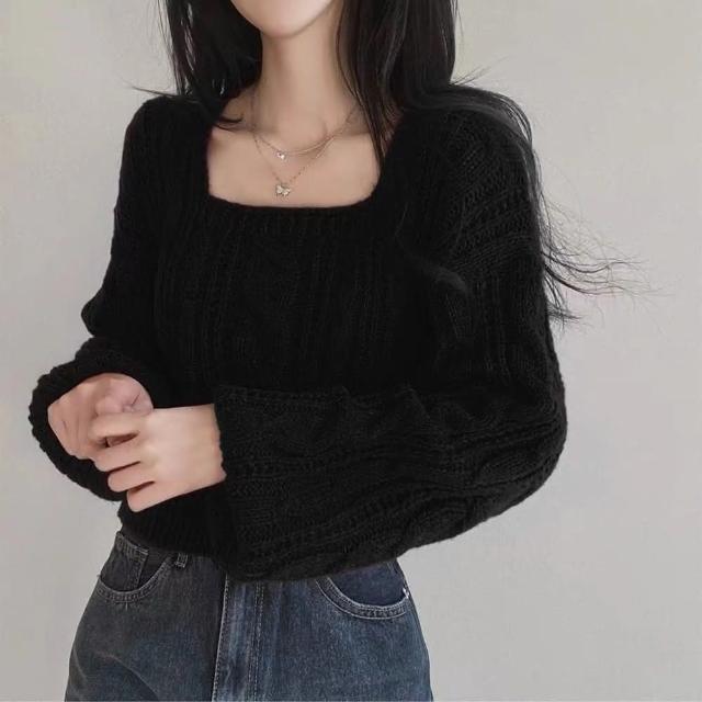 D.studio韓版方領氣質泡泡袖針織上衣 毛衣 長袖上衣 女裝 衣服 長袖t恤 保暖上衣 冬裝 發熱衣 W545