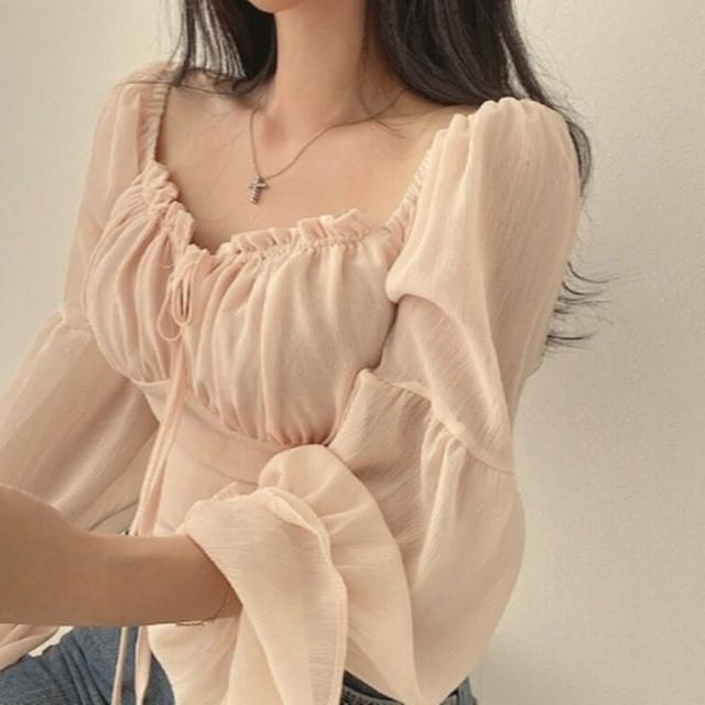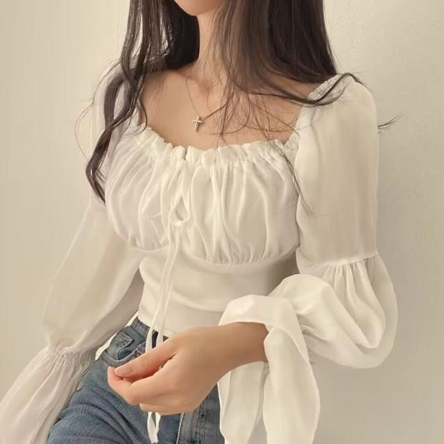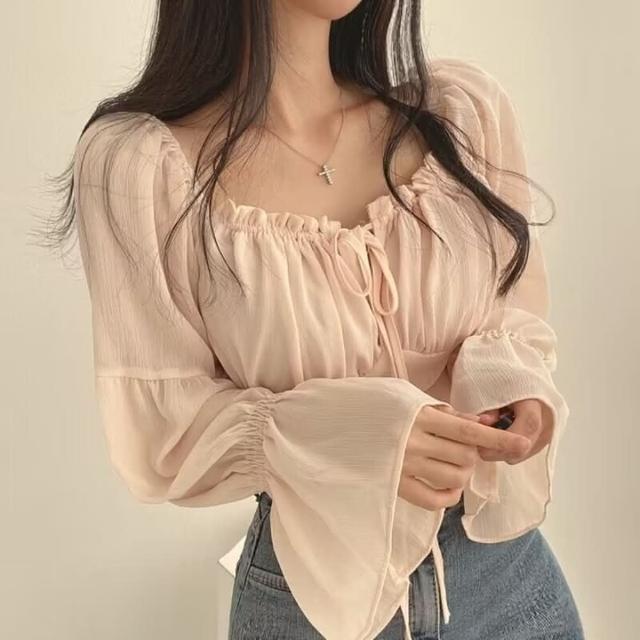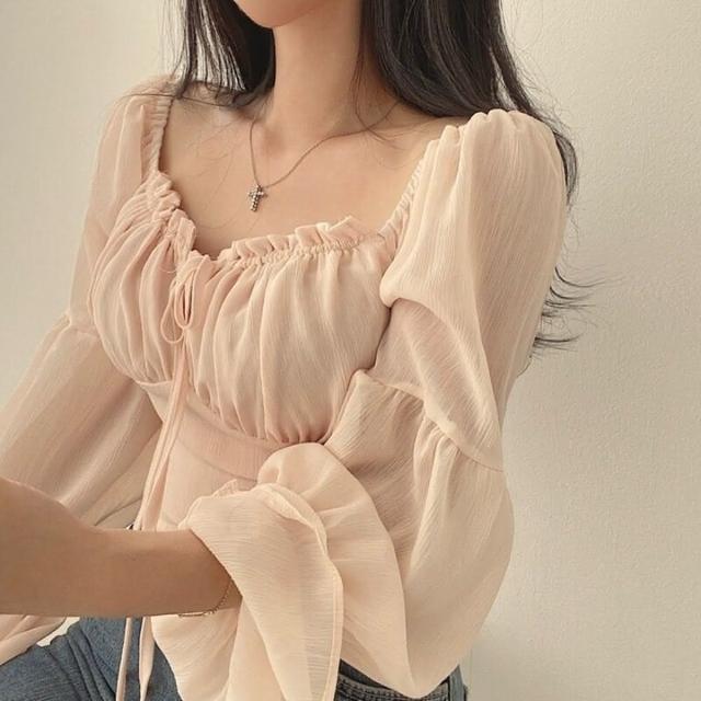 D.studio韓版法式氣質方領喇叭袖雪紡襯衫 長袖上衣 女裝 衣服 長袖t恤 冬天女裝 秋冬女裝 W568
