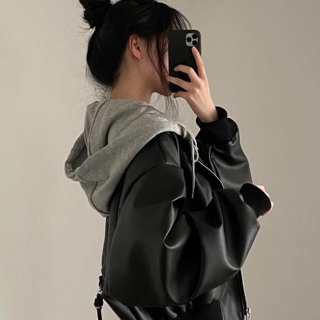 D.studio韓版復古寬鬆假兩件皮衣外套 連帽外套 女裝 衣服 上衣 保暖外套 保暖上衣 冬天外套 皮外套 J375