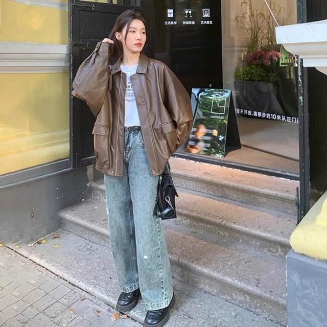 D.studio韓版寬鬆復古咖啡色皮衣 皮外套 夾克 機車外套 裝 衣服 上衣 保暖外套 保暖上衣 冬天外套 J382