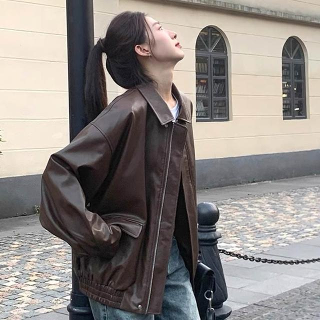 D.studio韓版寬鬆復古咖啡色皮衣 皮外套 夾克 機車外套 裝 衣服 上衣 保暖外套 保暖上衣 冬天外套 J382