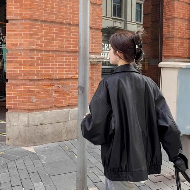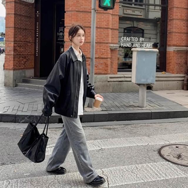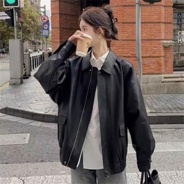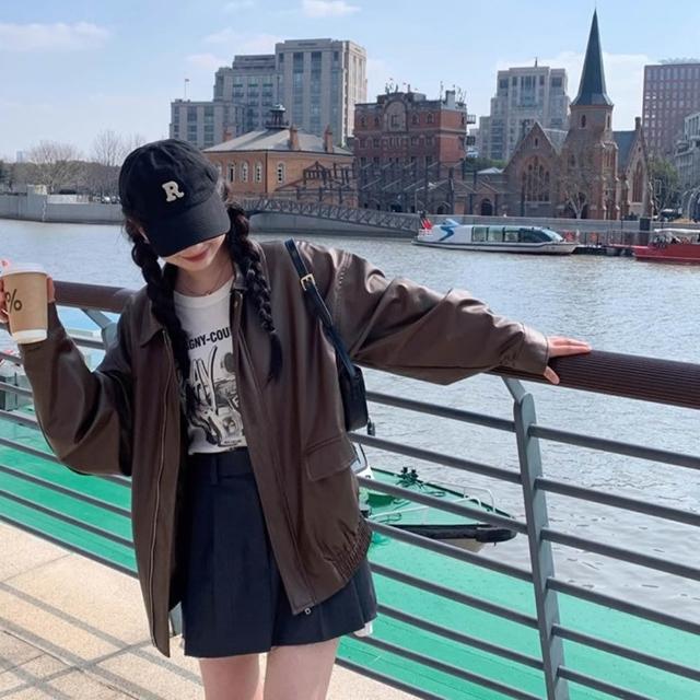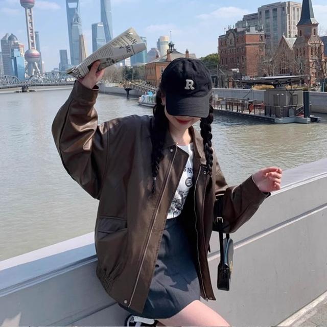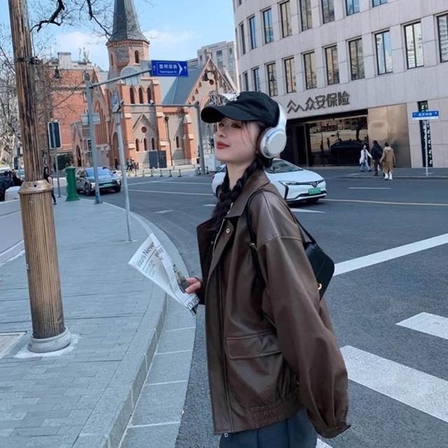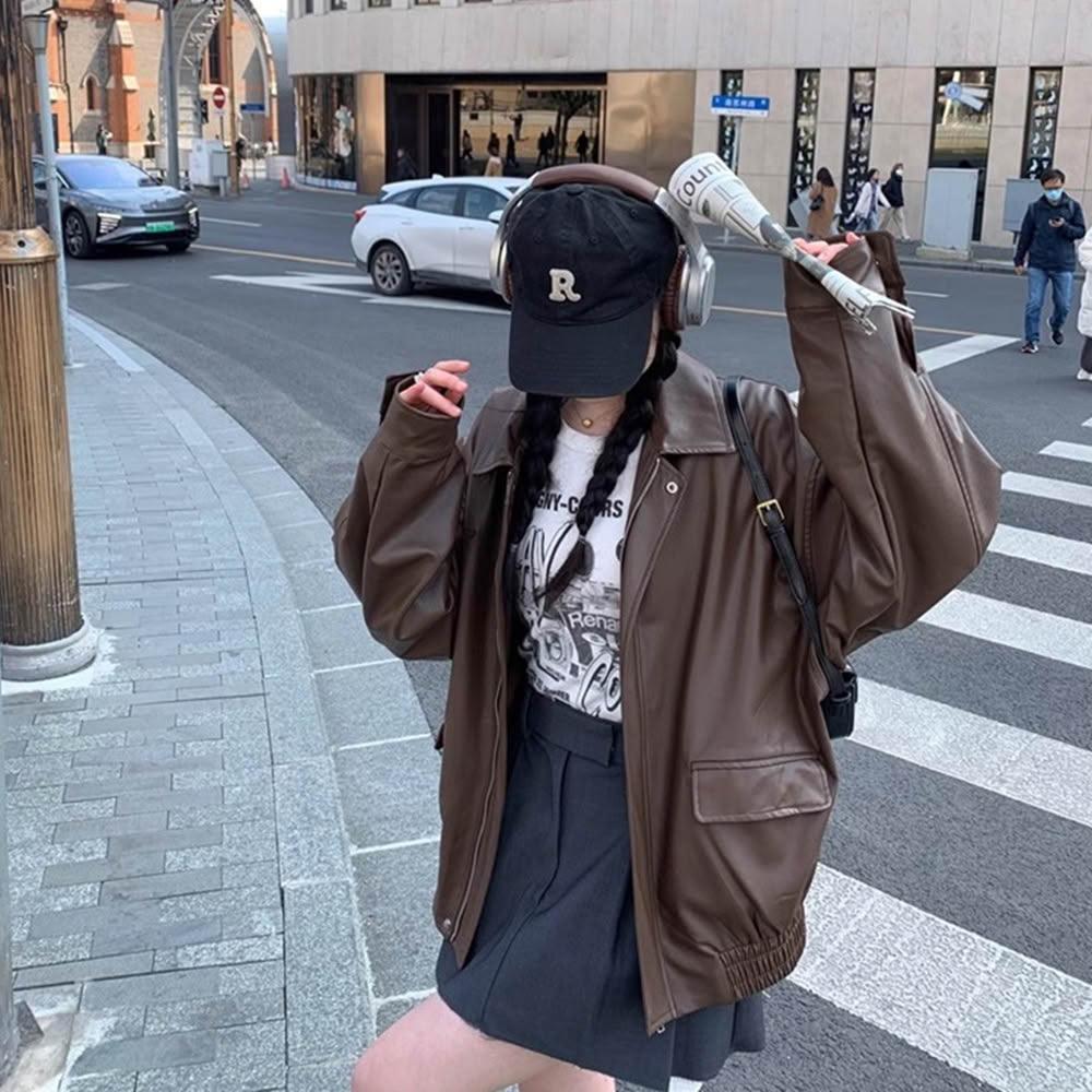 D.studio韓版美式寬鬆復古咖色皮衣外套 機車外套 夾克 皮外套 女裝 衣服 保暖外套 保暖上衣 冬天外套 J382
