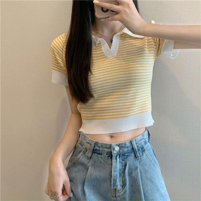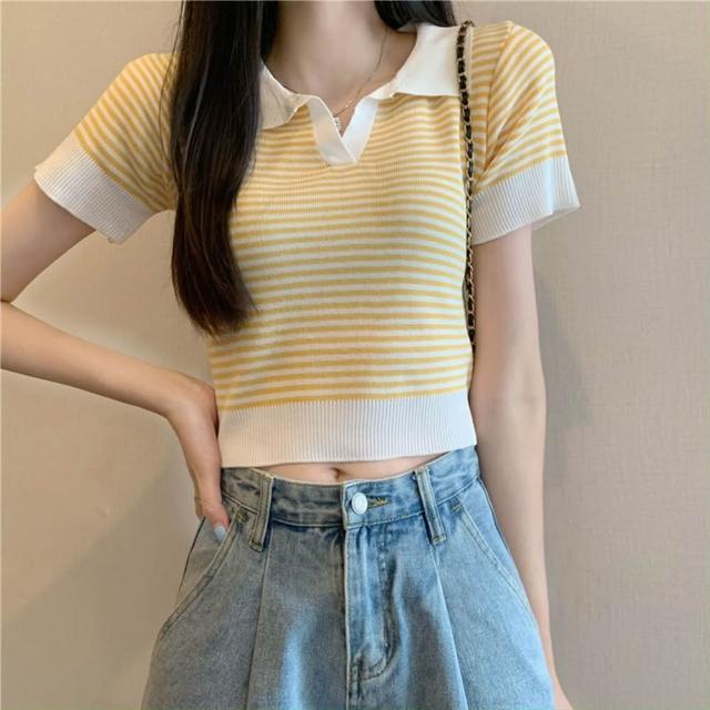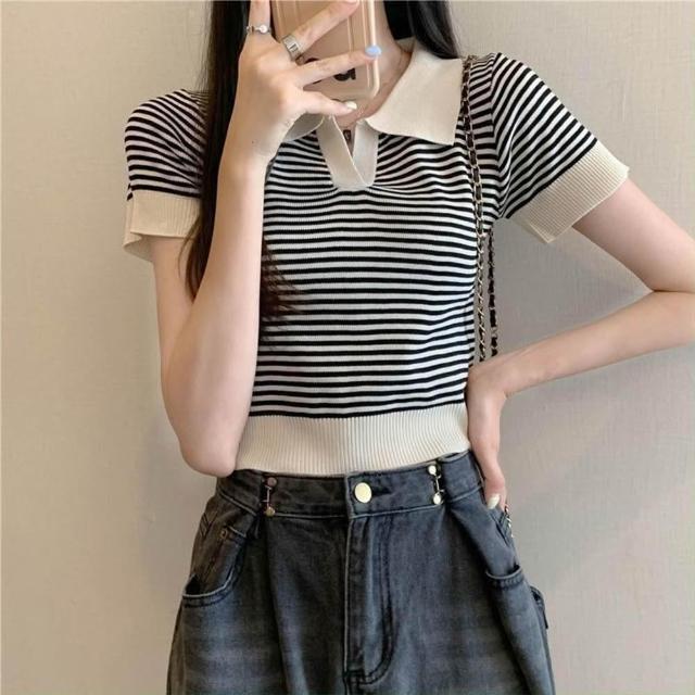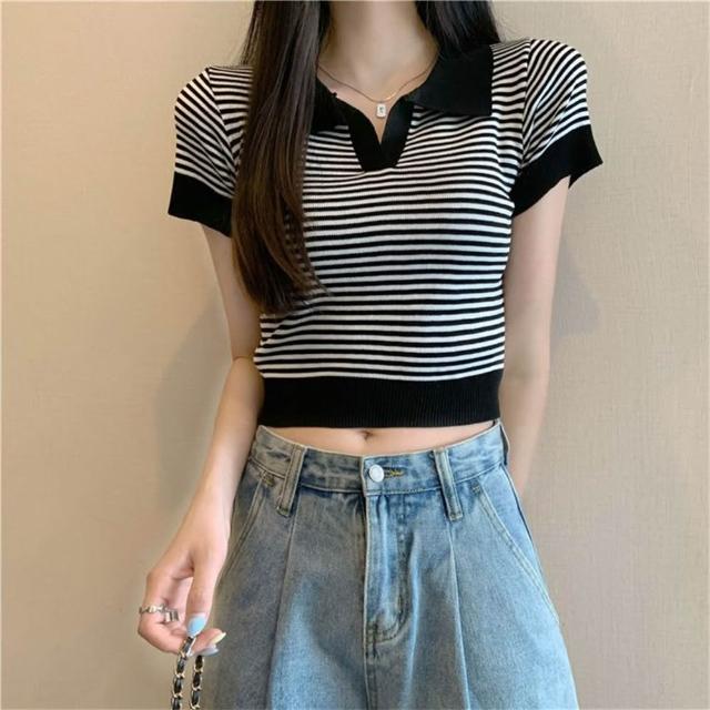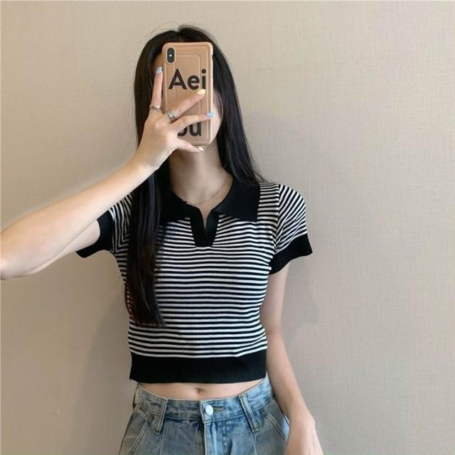 D.studio韓版條紋顯瘦短版上衣 針織上衣 短袖上衣 衣服 夏天女裝 短板上衣 短版t恤 女裝 短袖t恤女【T650】