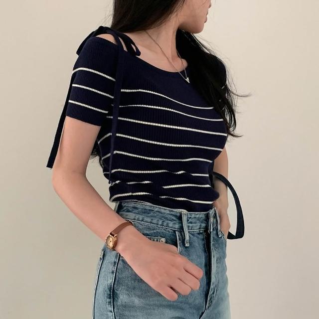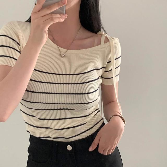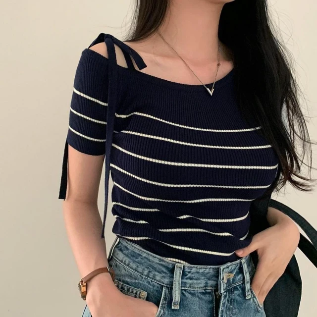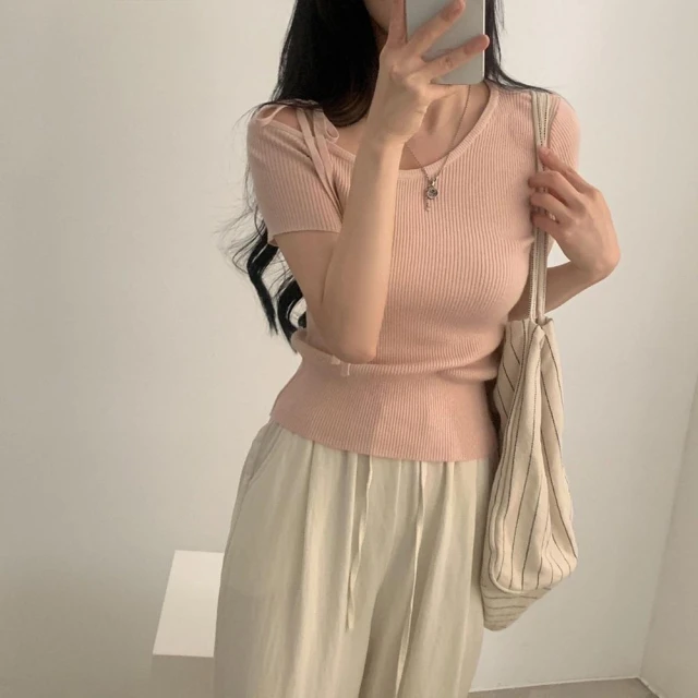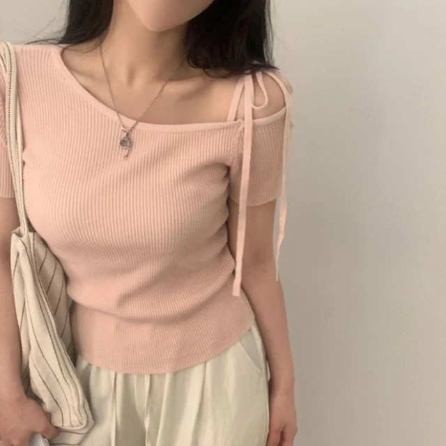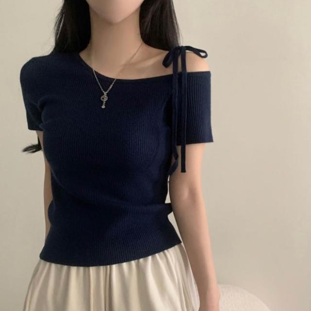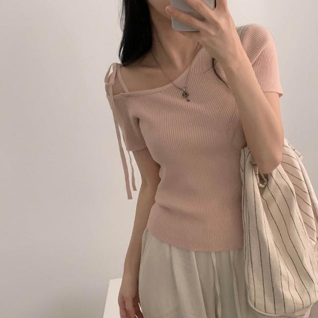 D.studio韓版露肩短袖針織上衣 斜肩 短袖上衣 顯瘦上衣 衣服 夏天女裝 短板上衣 女裝 短袖t恤女【T645】