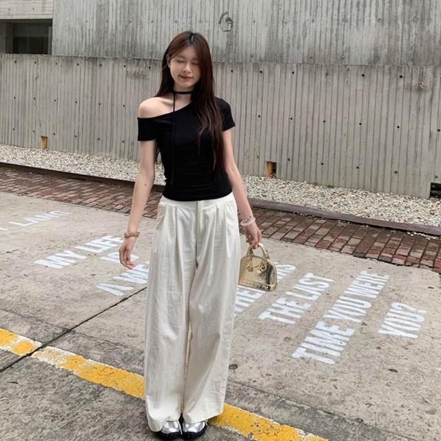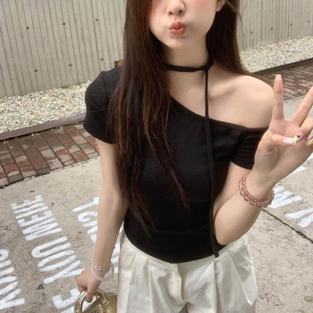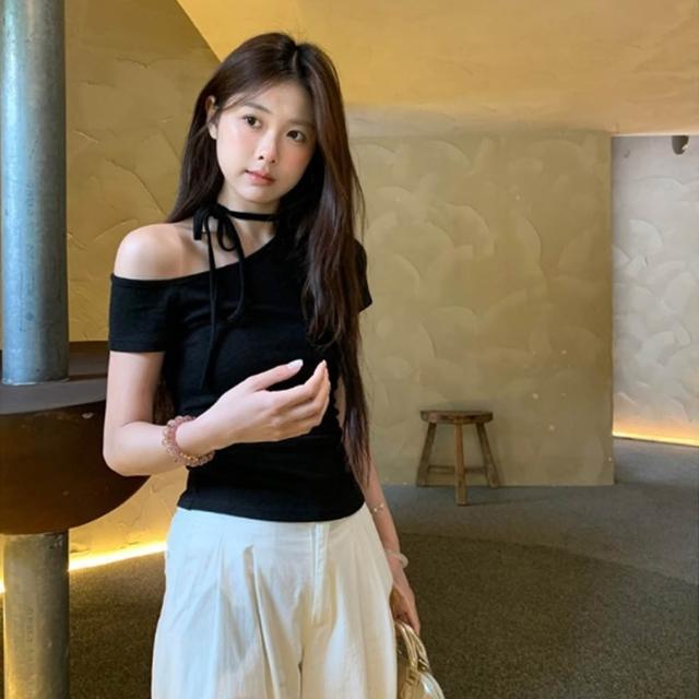 D.studio韓版斜肩氣質飄帶露肩上衣 短袖上衣 顯瘦上衣 衣服 夏天女裝 短版t恤 女裝 短袖t恤女【T664】