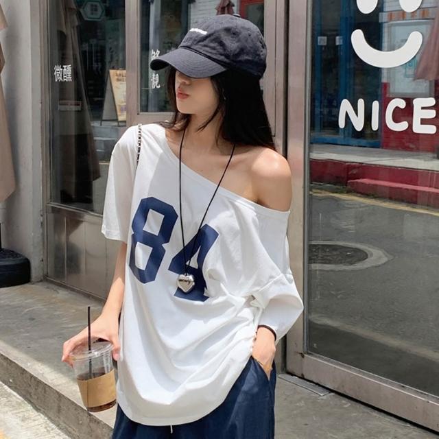 D.studio韓版設計感寬鬆斜肩短袖上衣 衣服 夏天女裝 露肩上衣 短版t恤 女裝 短袖t恤女 斜肩上衣【T676】