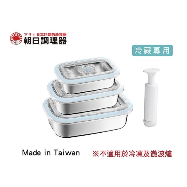 ASAHI 朝日鍋具台灣製 不鏽鋼真空保鮮盒/便當4件組 1550ml+950ml+550ml+抽真空筒(食品級矽膠條設計)