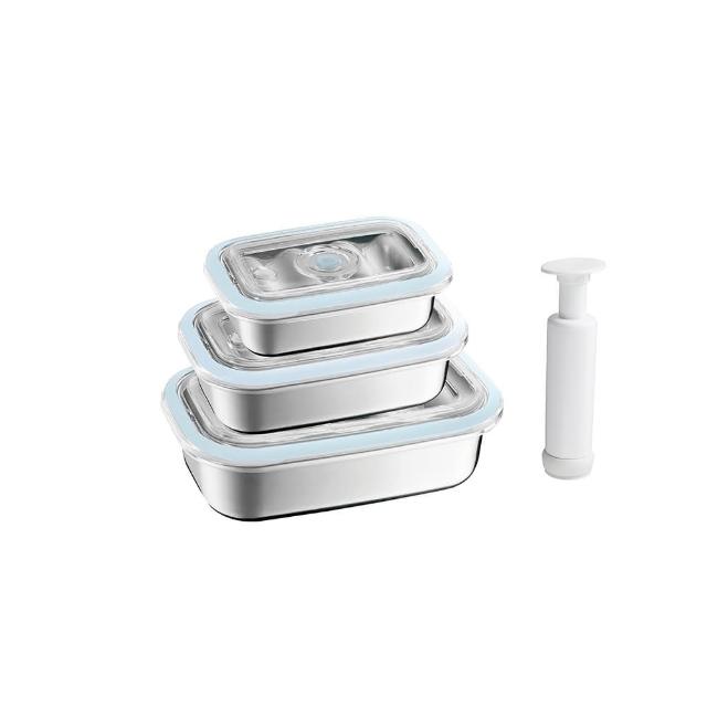 ASAHI 朝日鍋具台灣製 不鏽鋼真空保鮮盒 1550ml+950ml+550ml+抽真空筒 (食品級矽膠條設計)