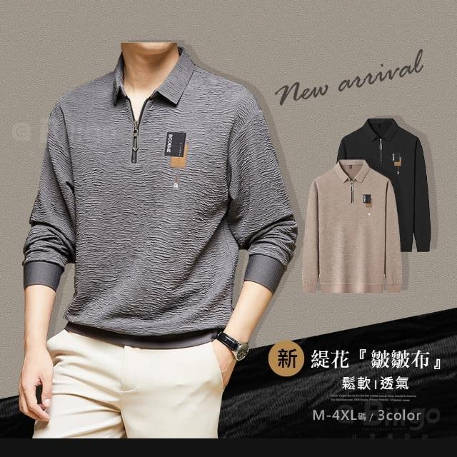 Billgo皺皺刺繡拉鍊翻領大學T-3色 M~4XL 男生薄長袖緹花POLO衫 寬鬆V領透氣上衣