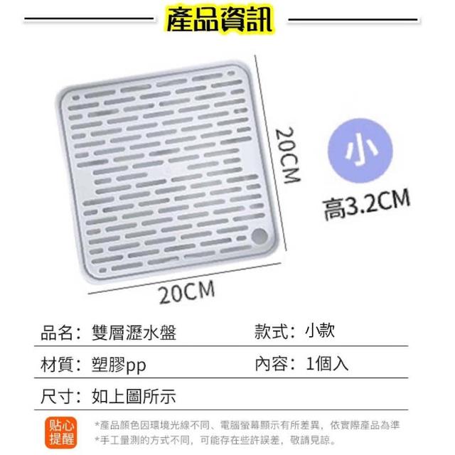 咪咪購物日式雙層瀝水盤|20*20*3.2cm(廚房托盤 瀝水盤 集水盤 滴水盤 接水盤 瀝水架 瀝水托盤 水果托盤 茶盤 泡茶盤)