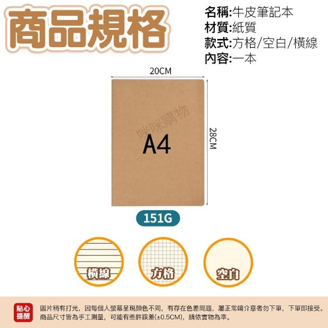咪咪購物牛皮筆記本|A4|10本(空白筆記本 方格筆記本 格子筆記本 橫線筆記本 簡約質感 笔记本 計算紙 記事本 筆記本)