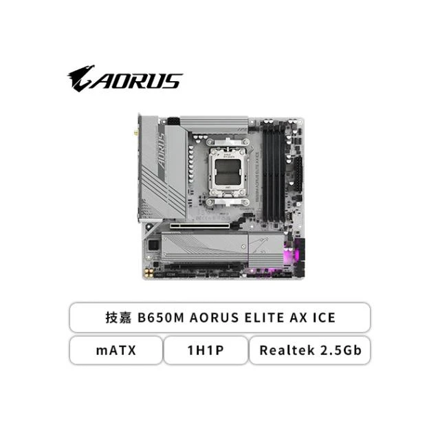 GIGABYTE 技嘉B650M AORUS ELITE AX ICEmATX/1H1P/Realtek 2.5Gb/Wi-Fi 6E+BT 5.3/註冊五年保