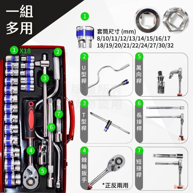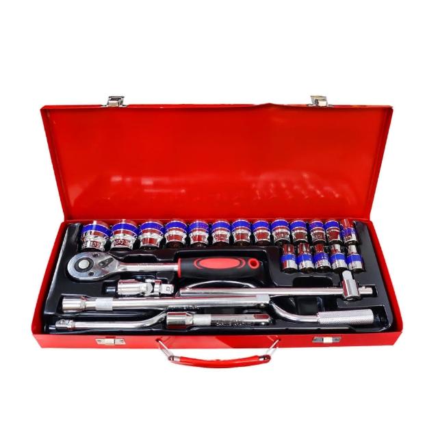 高級烤漆鐵盒套筒工具組(套筒工具組 24件 六角套筒 1/2 4分棘輪扳手 四分套筒 汽車工具 機車工具 維修工具)