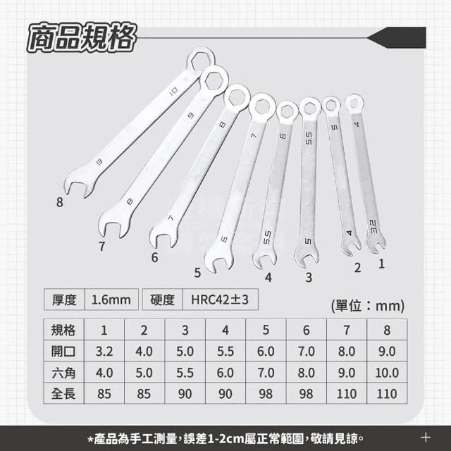 超薄扳手8件組(台灣製 加硬 開口扳手 梅花扳手 六角扳手 梅開扳手 薄型扳手 扳手 板手 開口板手)
