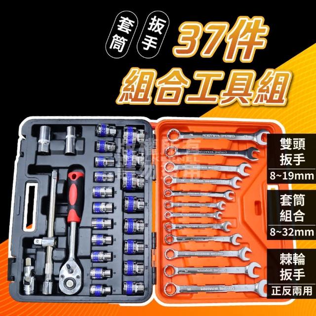 入門首選 37件手工具 全配附收納盒(維修工具組 4分棘輪扳手 「工具仁」六角套筒 開口扳手 梅開板手 汽車 機車 保養)