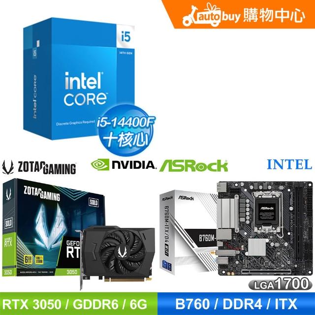 Intel 英特爾〈自MO價〉i5-14400F+華擎 B760M-ITX/D4 WiFi/ITX/3+1年保/LGA1700+ZOTAC RTX3050 6G GDDR6 Solo 顯示卡
