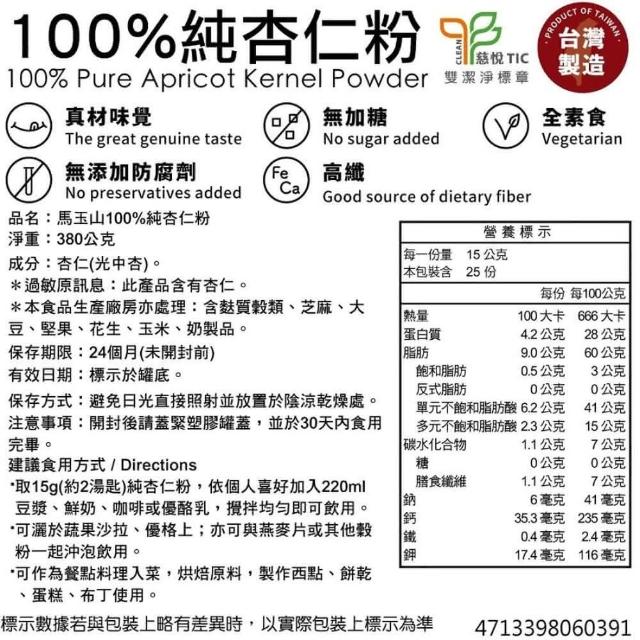 馬玉山馬玉山杏仁粉全系列 馬玉山100%純杏仁粉380g(沖泡飲)