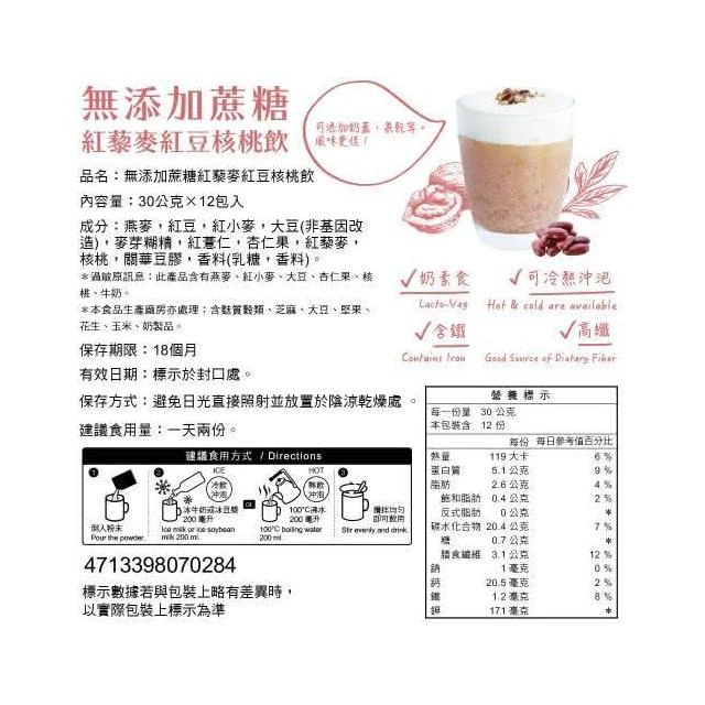 馬玉山馬玉山沖泡 無添加蔗糖紅藜麥杏仁核桃飲 紅豆核桃飲 黑豆核桃飲 黑芝麻核桃飲 30gx12包入沖泡飲品(沖泡飲)