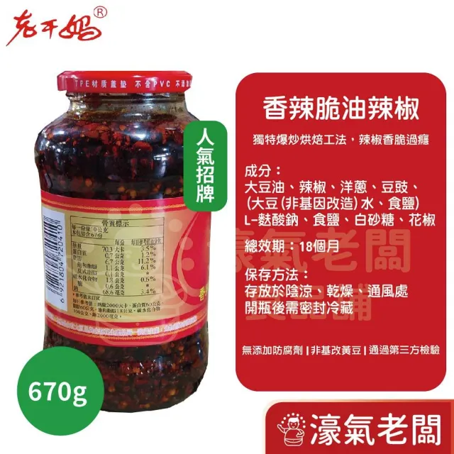老干媽老干媽香辣脆油辣椒 670g/老干媽油辣椒730g/豆豉油制辣椒740g(辣椒油)