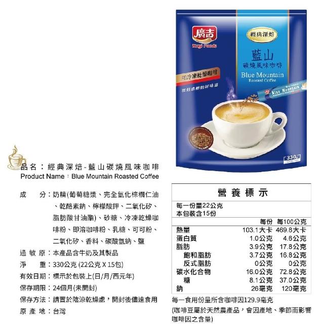廣吉經典深焙即溶咖啡 藍山碳燒咖啡頂級黃金曼特寧(三合一咖啡)黃金曼特寧二合一咖啡(15入/袋)
