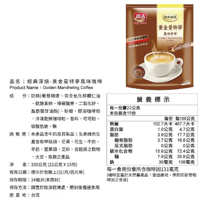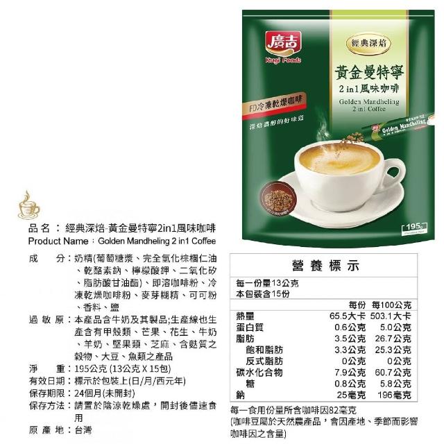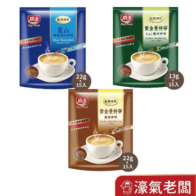 廣吉經典深焙即溶咖啡 藍山碳燒咖啡頂級黃金曼特寧(三合一咖啡)黃金曼特寧二合一咖啡(15入/袋)