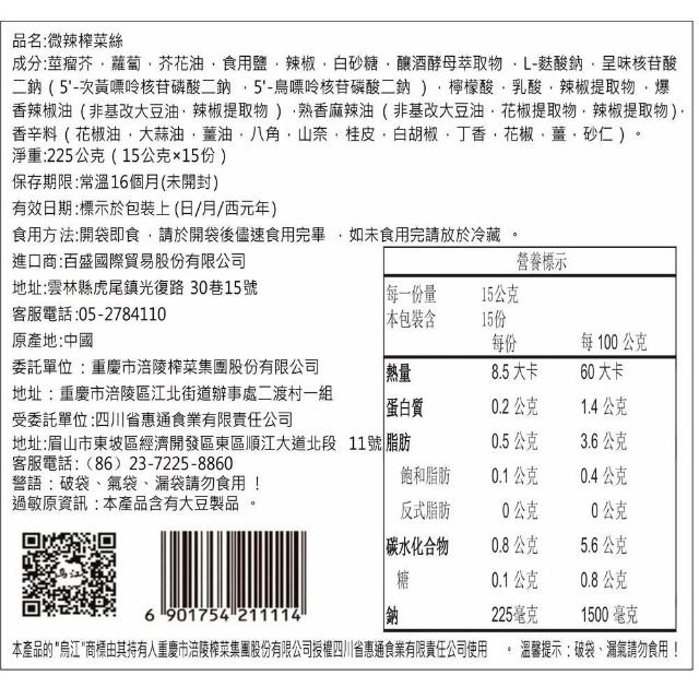 【烏江榨菜】微辣榨菜絲225g 滿件折