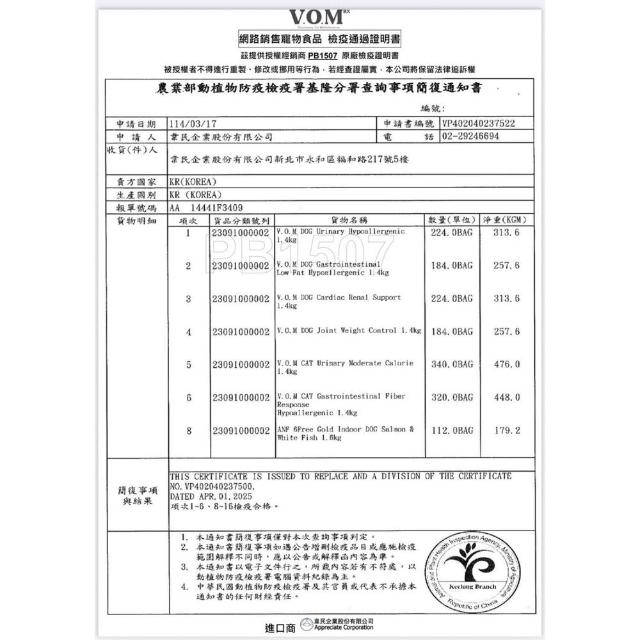 VOM韓國 VOM 貓用複合處方飼料 1.4KG 泌尿道 腸胃道 腎臟保健 貓主食 貓乾糧 貓飼料