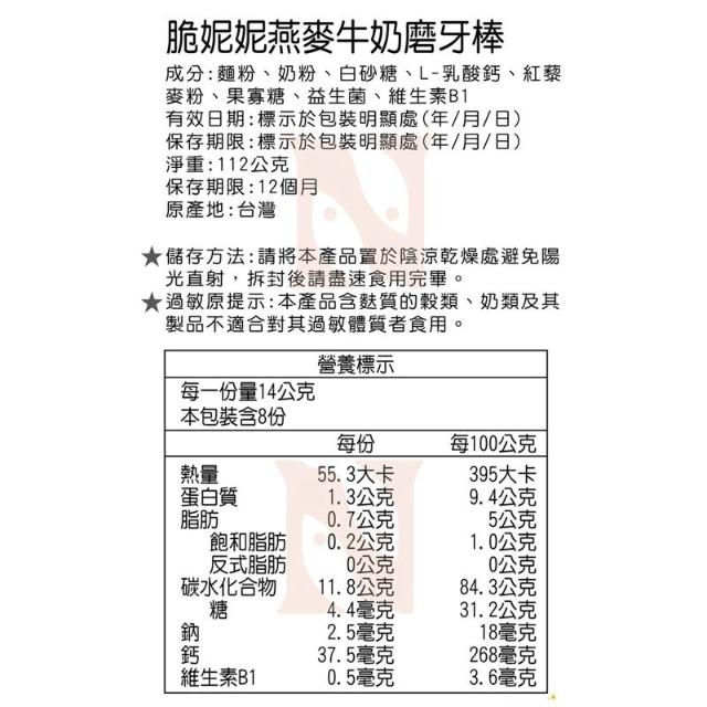 寶寶共和國脆妮妮Nutrinini 寶寶磨牙棒112g-牛奶/藜麥/燕麥(嬰兒磨牙餅/寶寶零食;寶寶共和國)