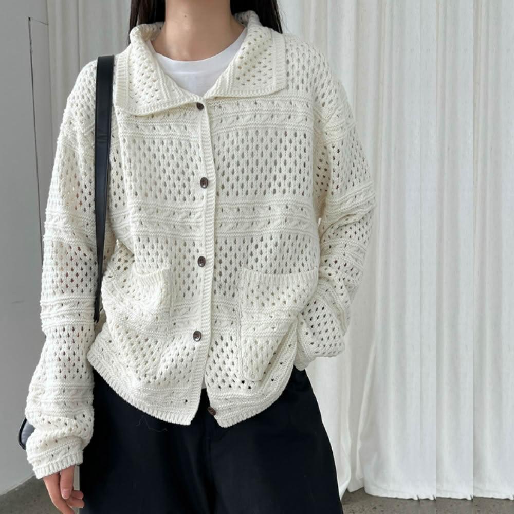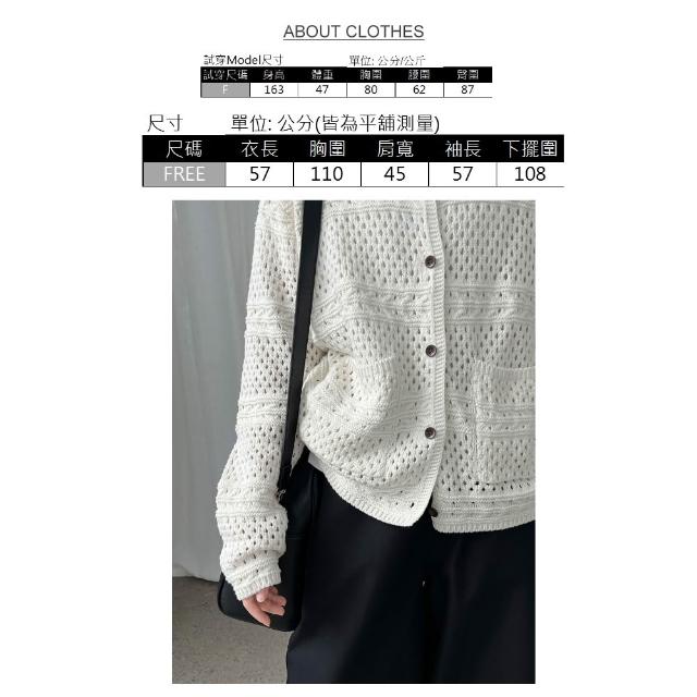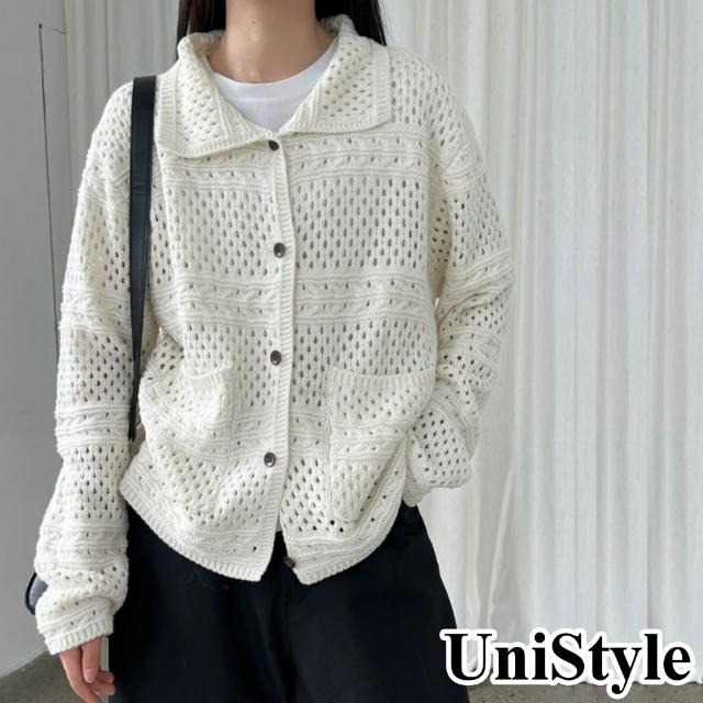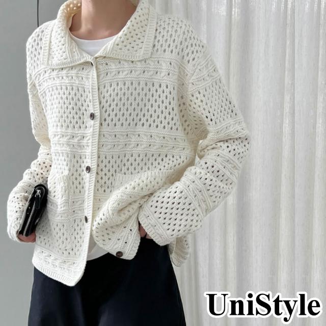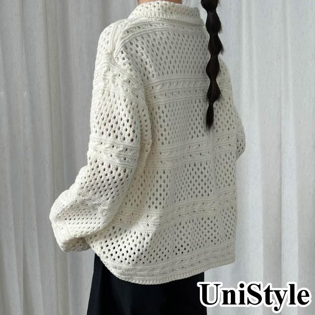 UniStyle秋長袖針織外套 韓版復古鈎花鏤空翻領上衣 UVss760(米)
