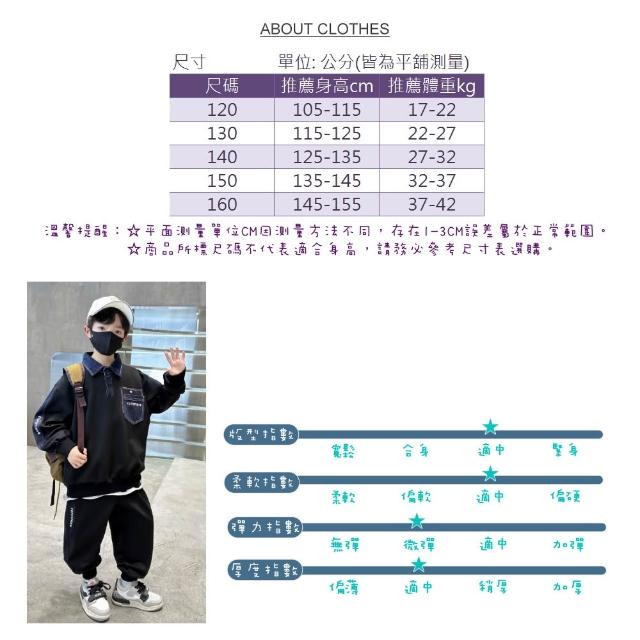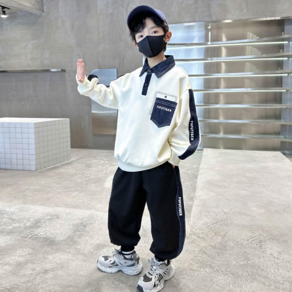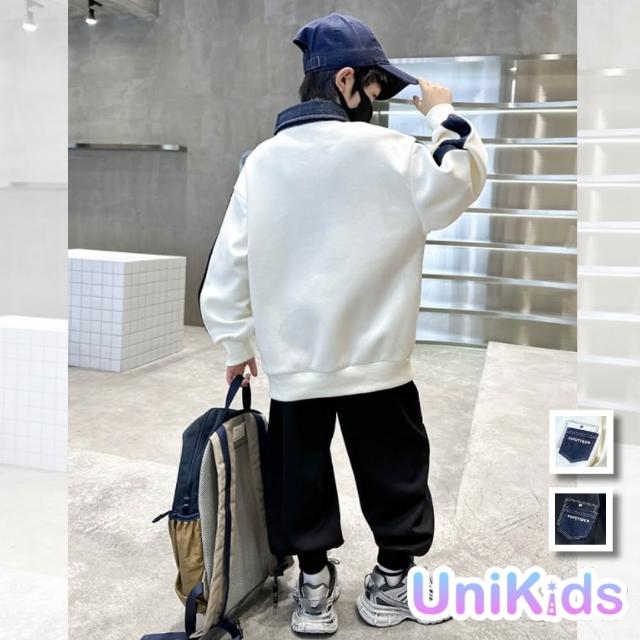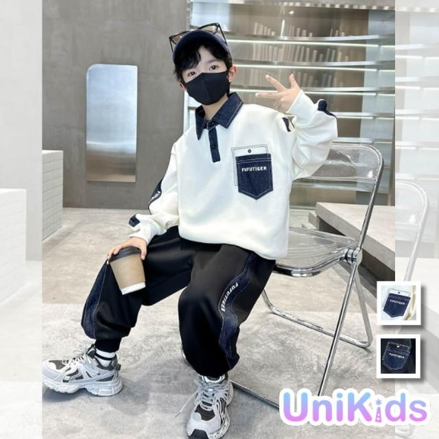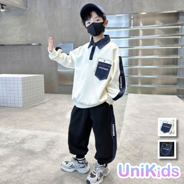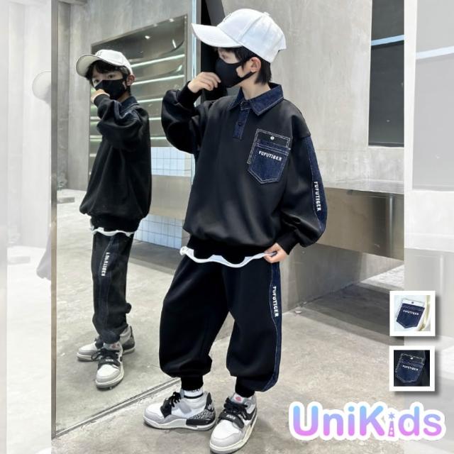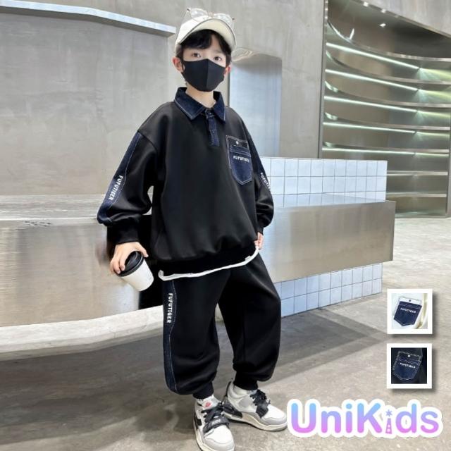 UniKids秋中大童裝2件套裝牛仔拼接長袖POLO衫T恤休閒長褲 男大童裝 VP25-07(黑 白)