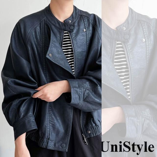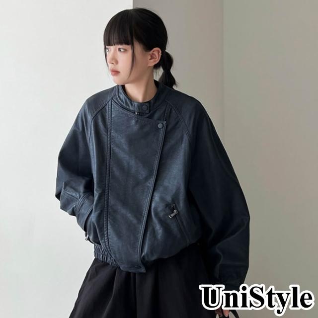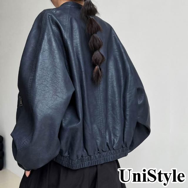 UniStyle秋長袖PU皮外套 韓版短款機車服夾克 女 UV9778(靛藍)