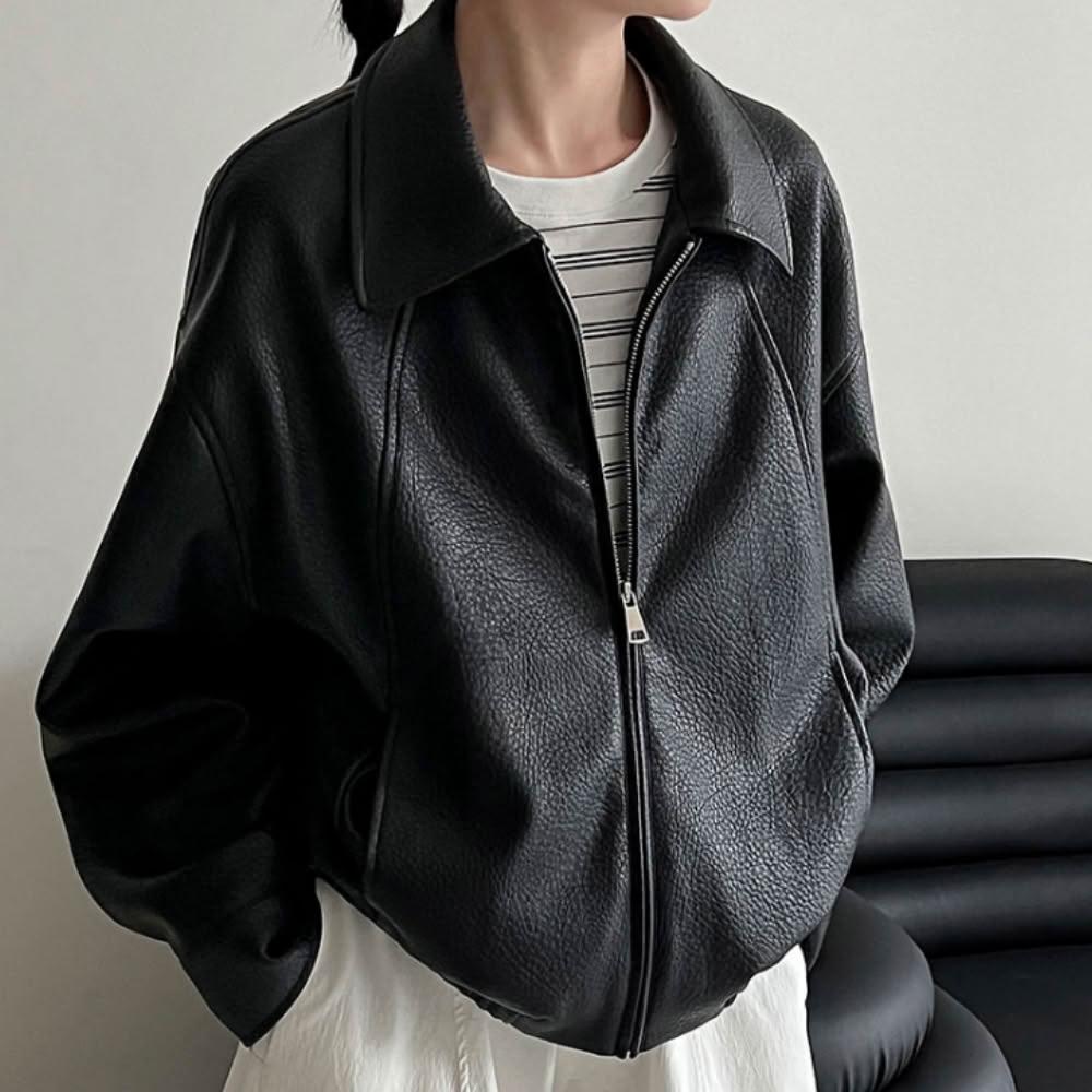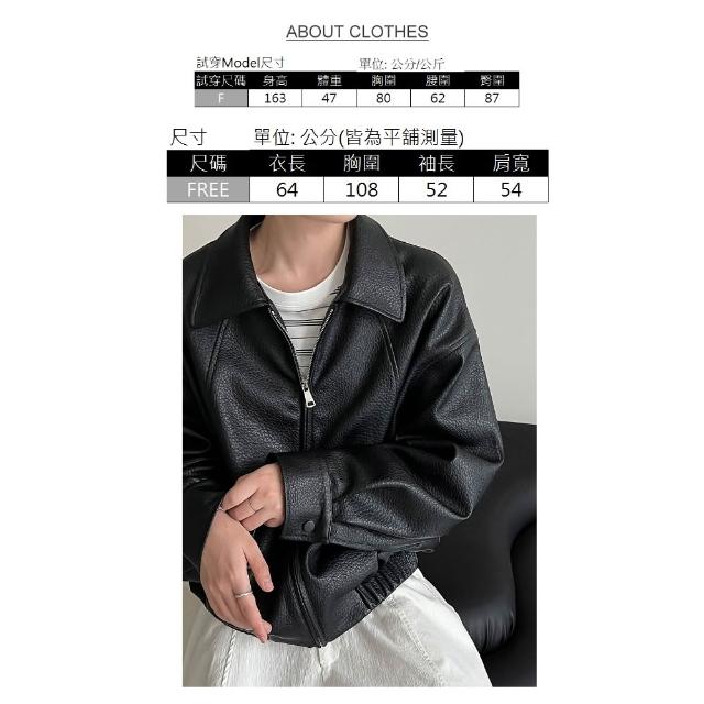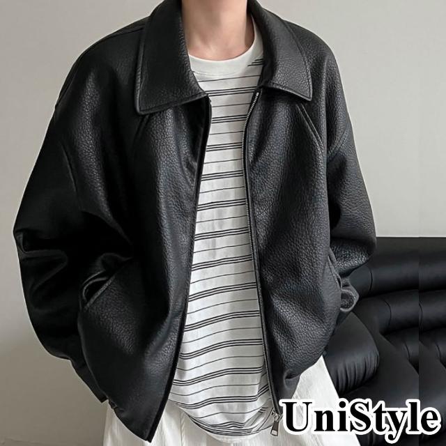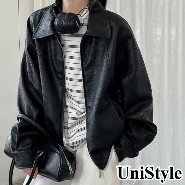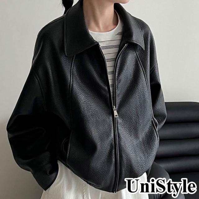 UniStyle秋長袖PU皮外套 韓版肌理感荔枝皮翻領機車服夾克 女 UV3719(黑)
