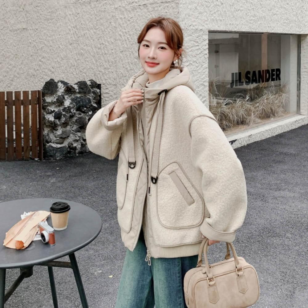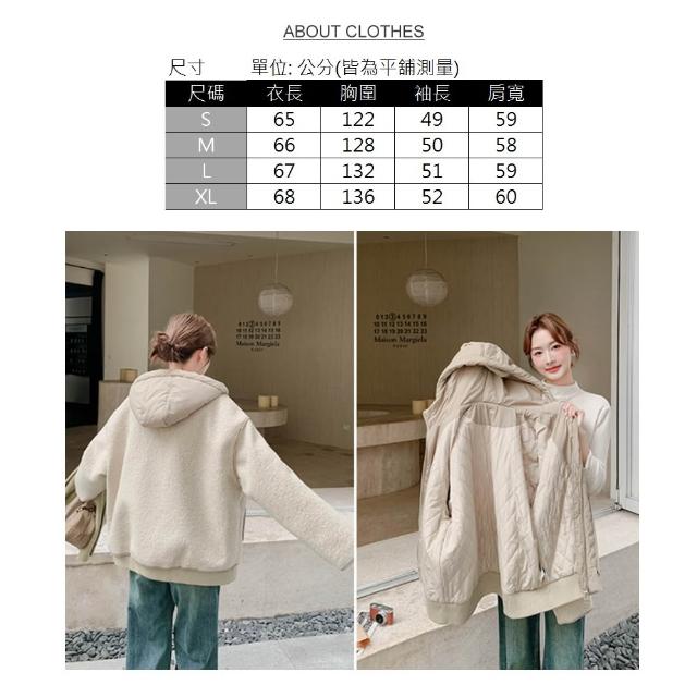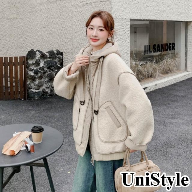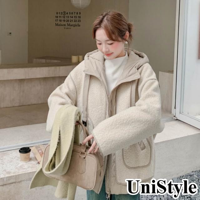 UniStyle秋冬加厚長袖連帽外套 韓系羊羔毛拼接毛茸夾克大衣 女 ZMR2D006-7318(米加厚)